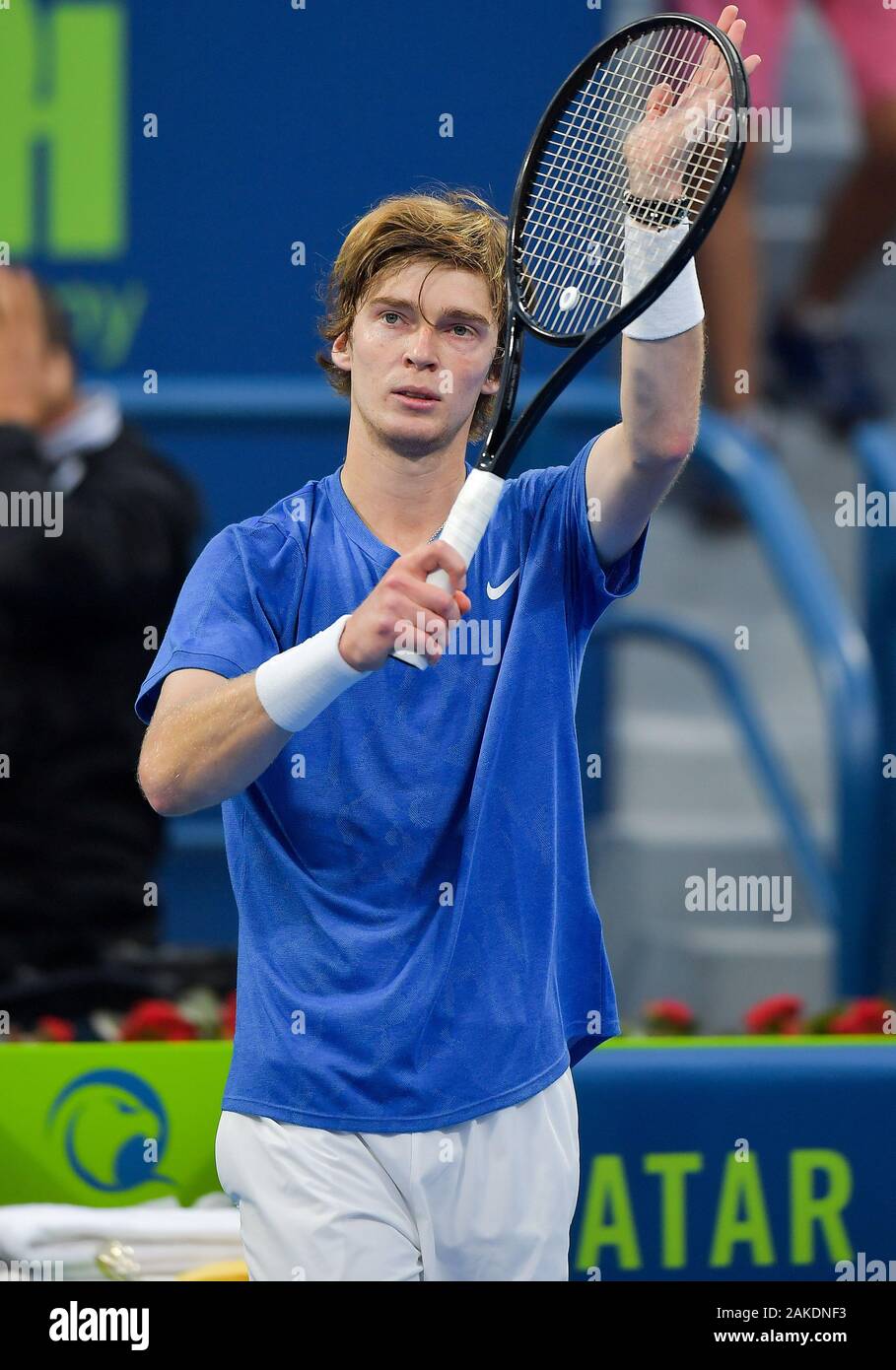 Doha Qatar 8th Jan 2020 Andrey Rublev Of Russia Celebrates After The Singles Second Round Match Between Mikhail Kukushkin Of Kazakistan And Andrey Rublev Of Russia At Atp Qatar Open Tennis Tournament